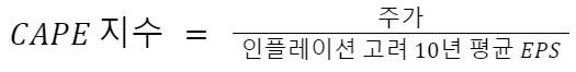 - CAPE(Shiller PE) 지수는 기업들의 주가가 과거 10년 평균 이익의 몇 배인지를 나타내는 지표.