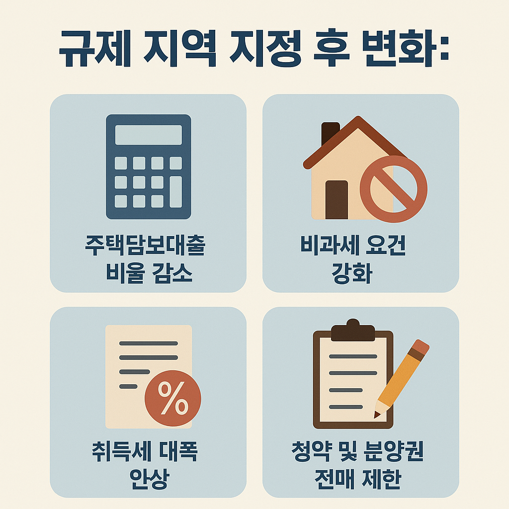 즉, 현재 수도권은 규제 지역으로 지정되기 직전의 상황에 놓여 있으며, 많은 전문가들이 규제 지역으로 지정될 가능성이 매우 높다고 분석하고 있습니다. 그렇다면, 규제 지역으로 지정되면 우리에게 어떤 변화가 있을까요?