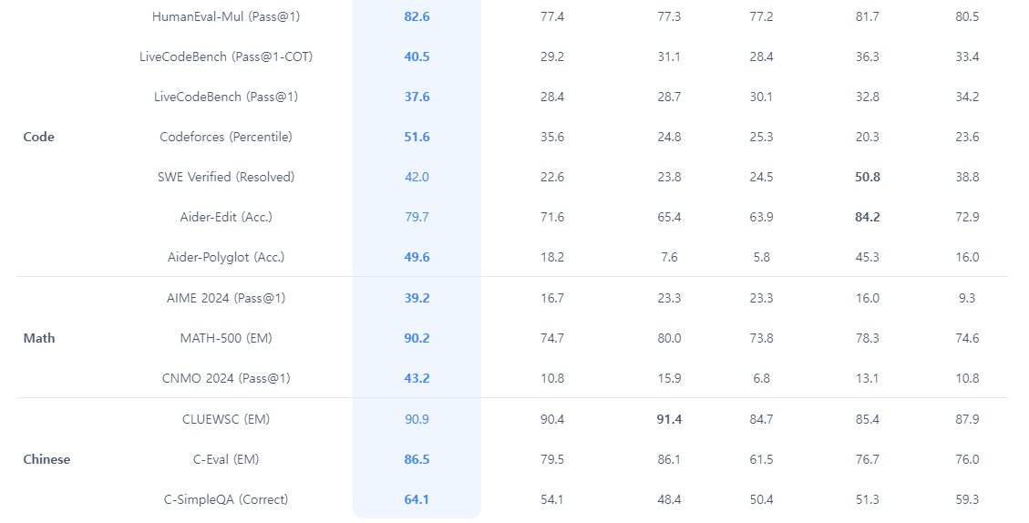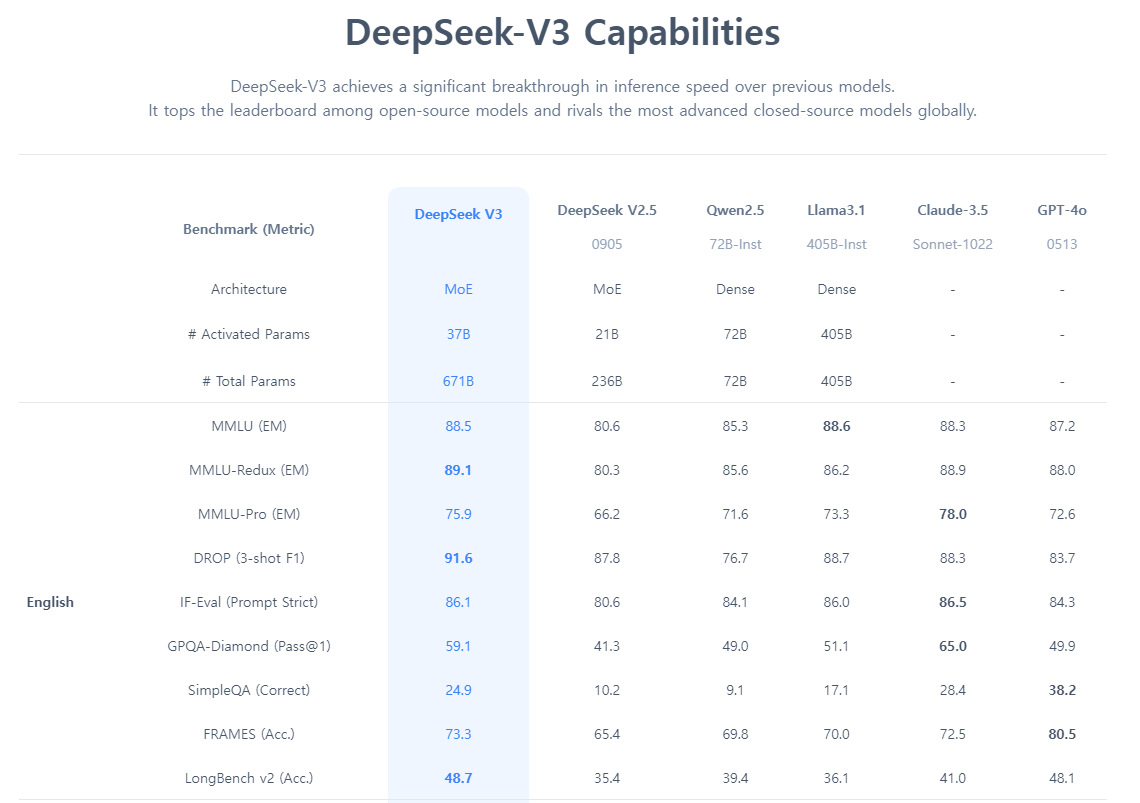 또한, 딥시크는 오픈 소스 모델인 '딥시크-V3'를 출시하였으며, 이 모델의 매개변수는 6710억 개에 달합니다. 이는 메타의 라마3.1보다 1.5배 많은 수치로, 역대 오픈 소스 모델 중 단연 최고 수준입니다.